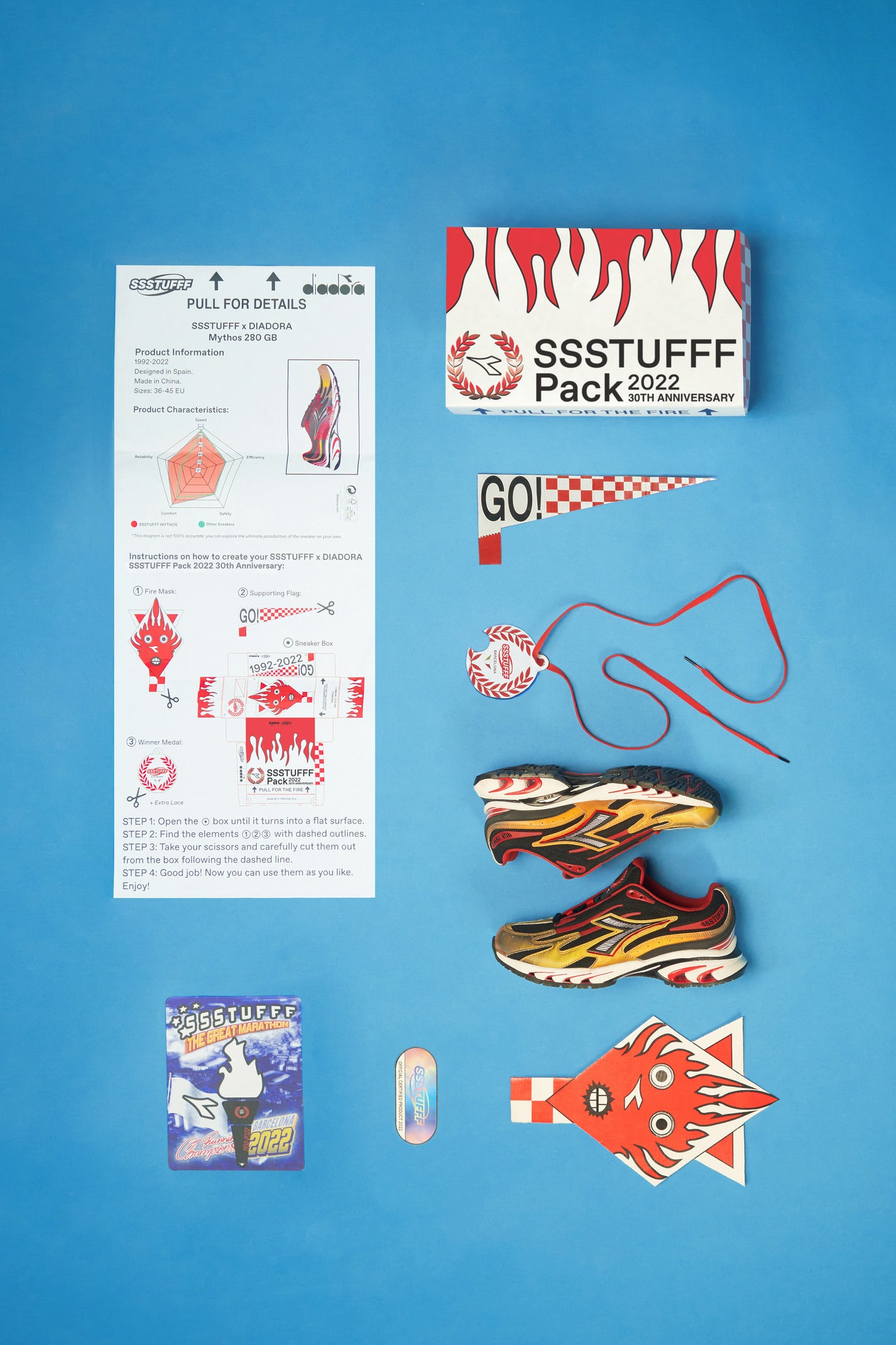 This sneaker was made to be seen, touched… and cut (yup, for real). The SSSTUFFF x Diadora Mythos 280GB is our tribute to the iconic Barcelona ’92 opening ceremony—but reimagined through our own chaotic, playful lens.