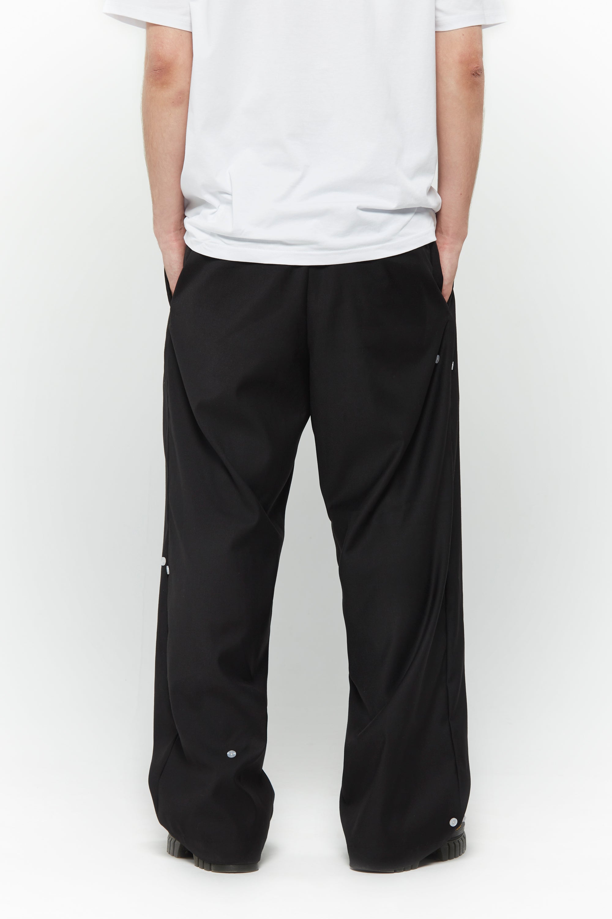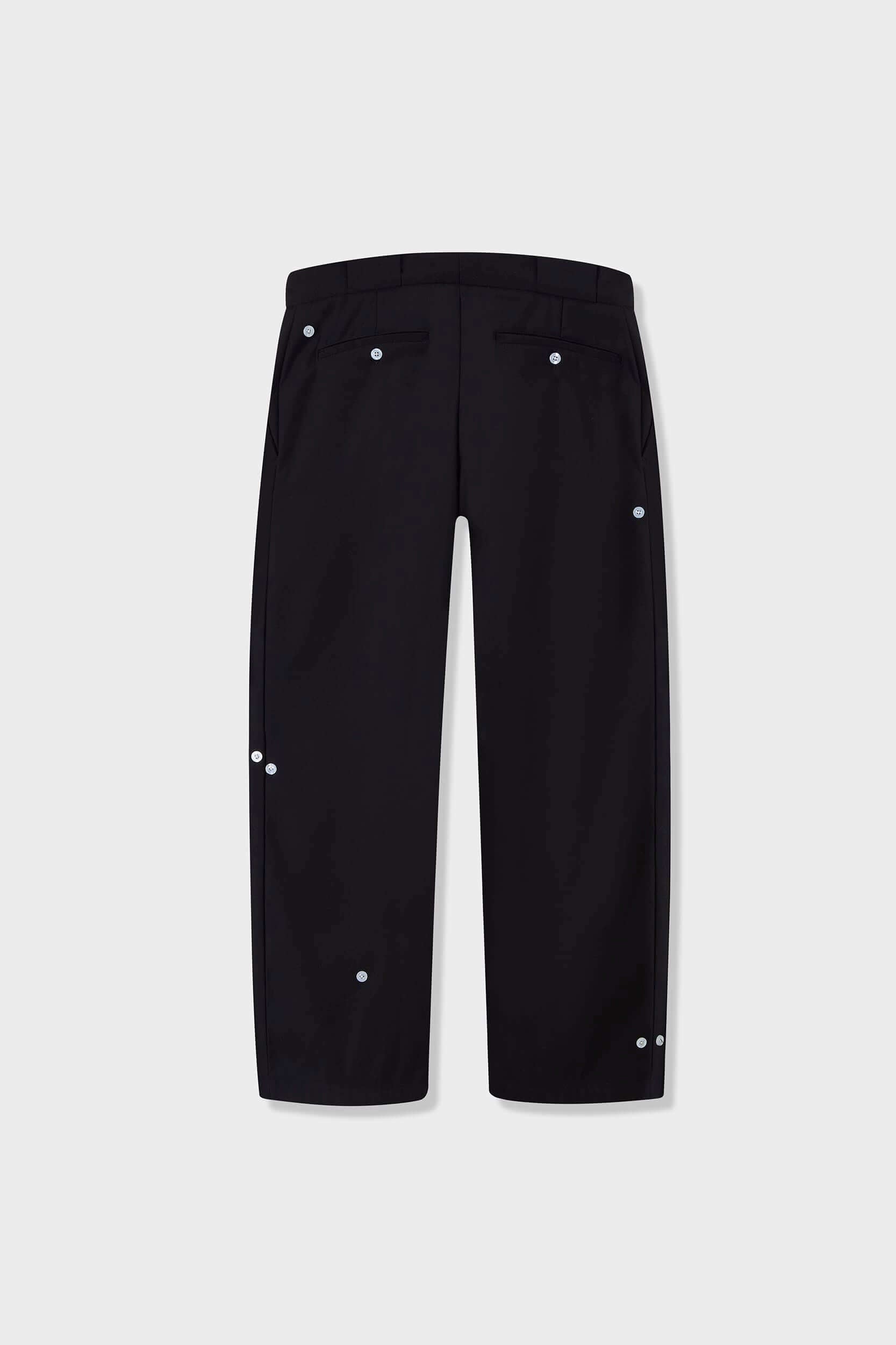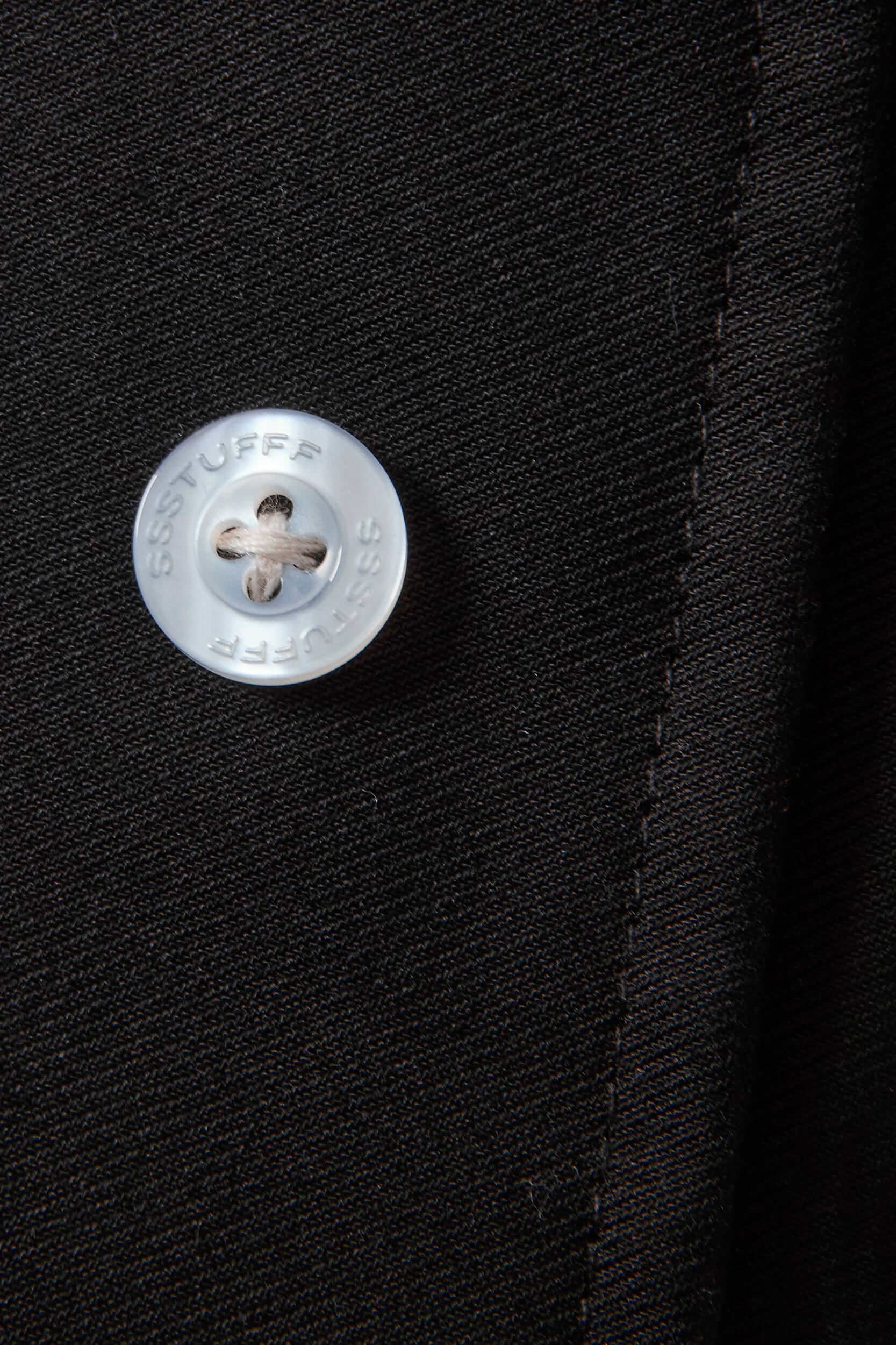 Black cotton twill trousers with tailored straight fit and SSSTUFFF button detailing on legs