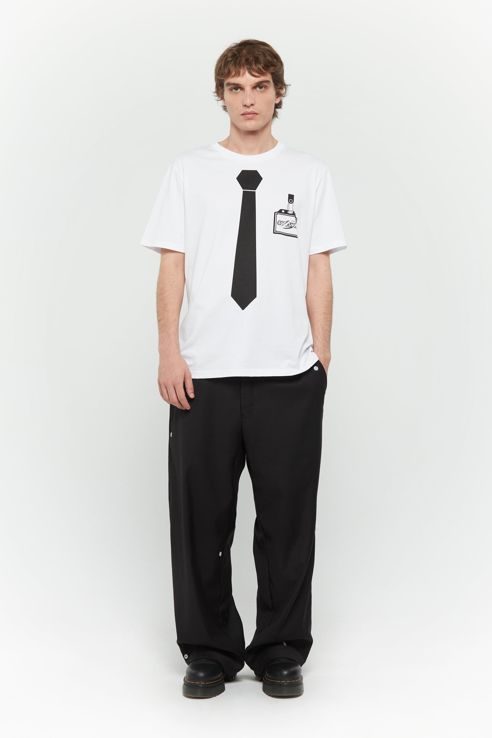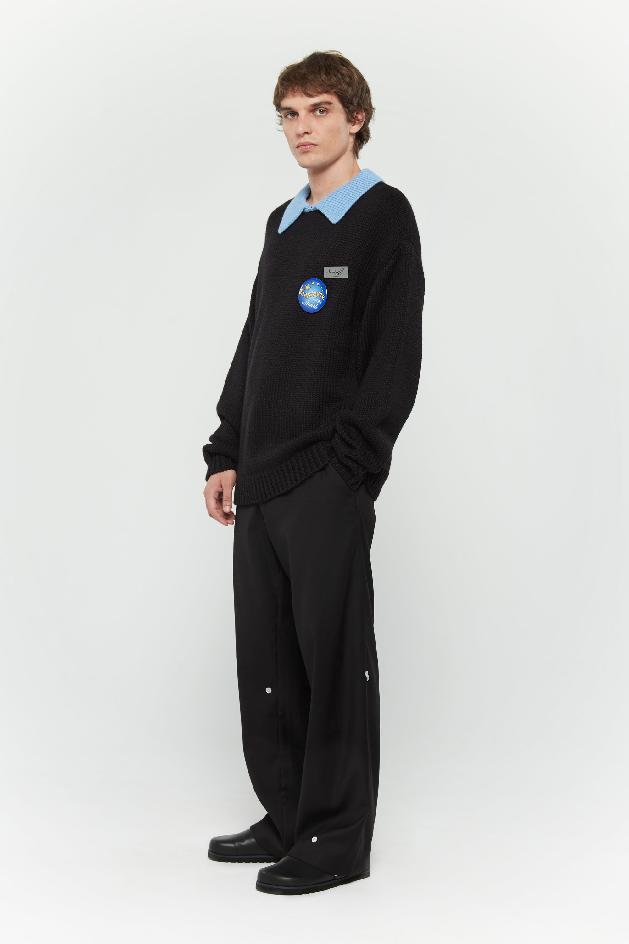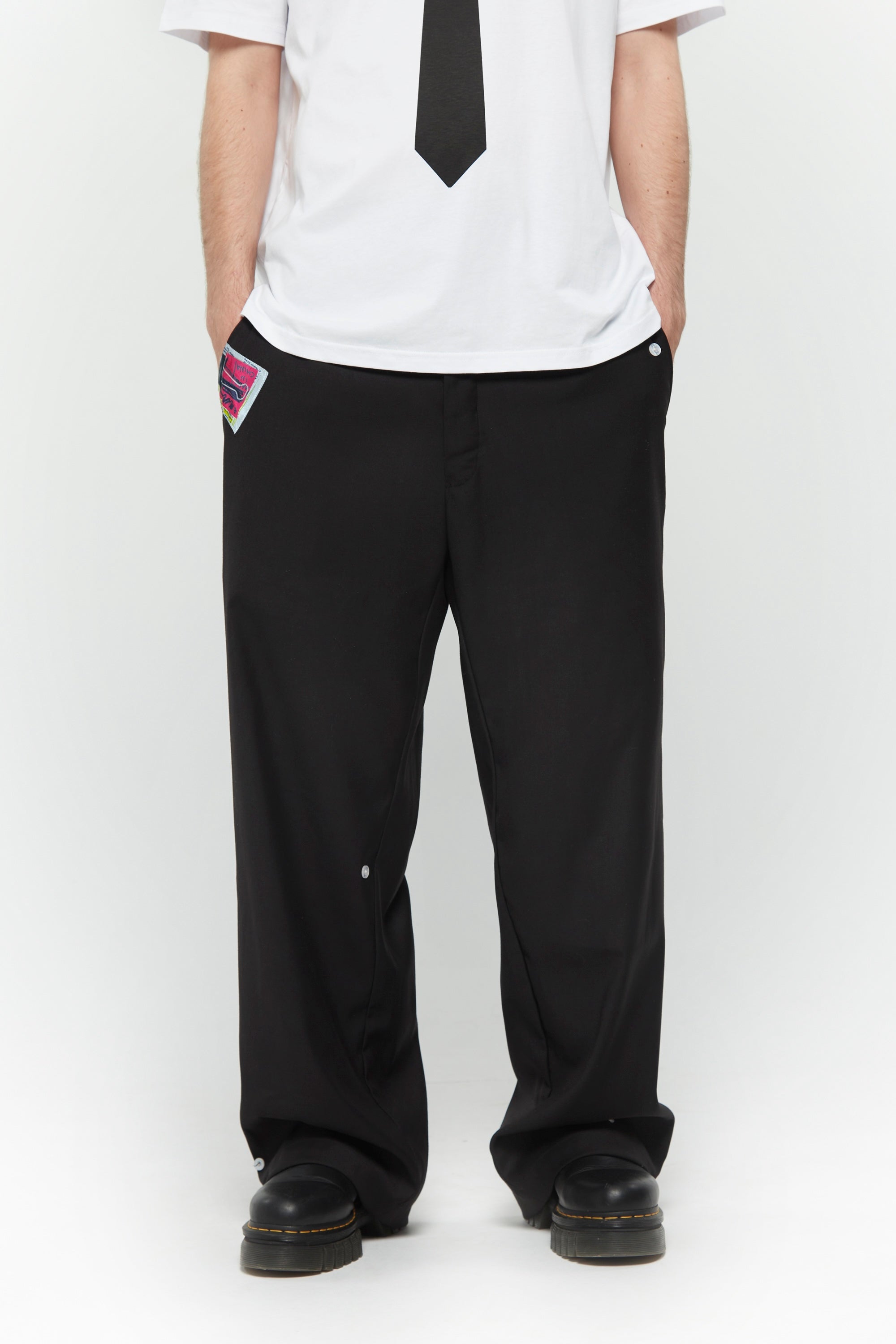 Black cotton twill trousers with tailored straight fit and SSSTUFFF button detailing on legs