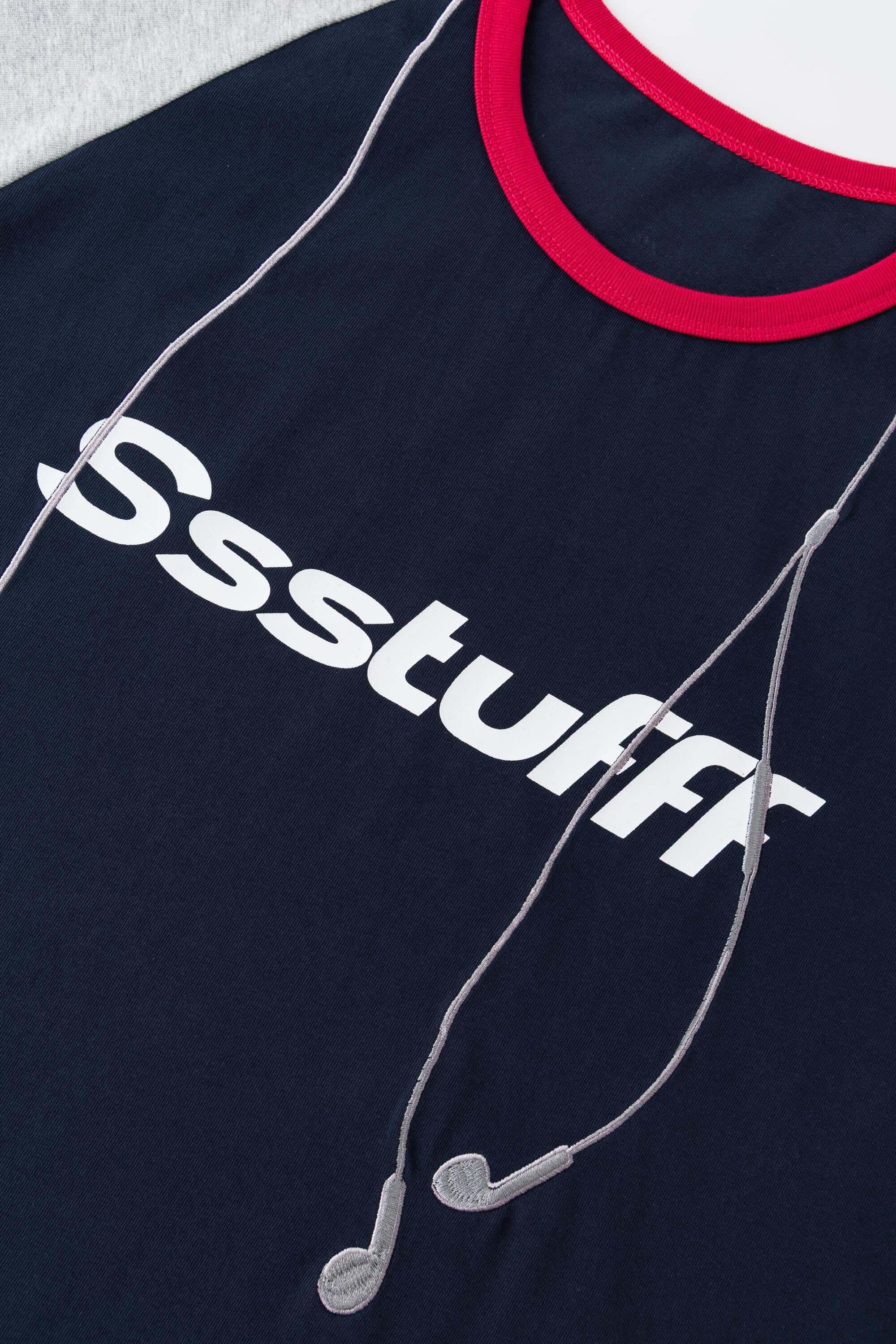-Headphone embroidery mimics the look of earphones hanging down from the chest.