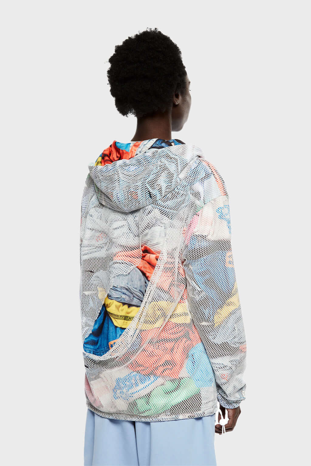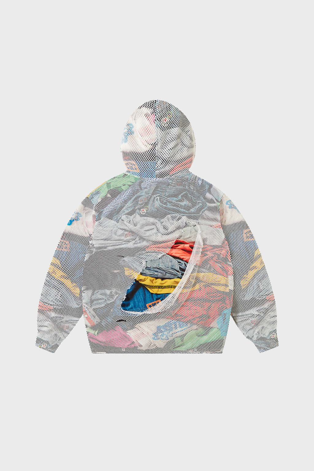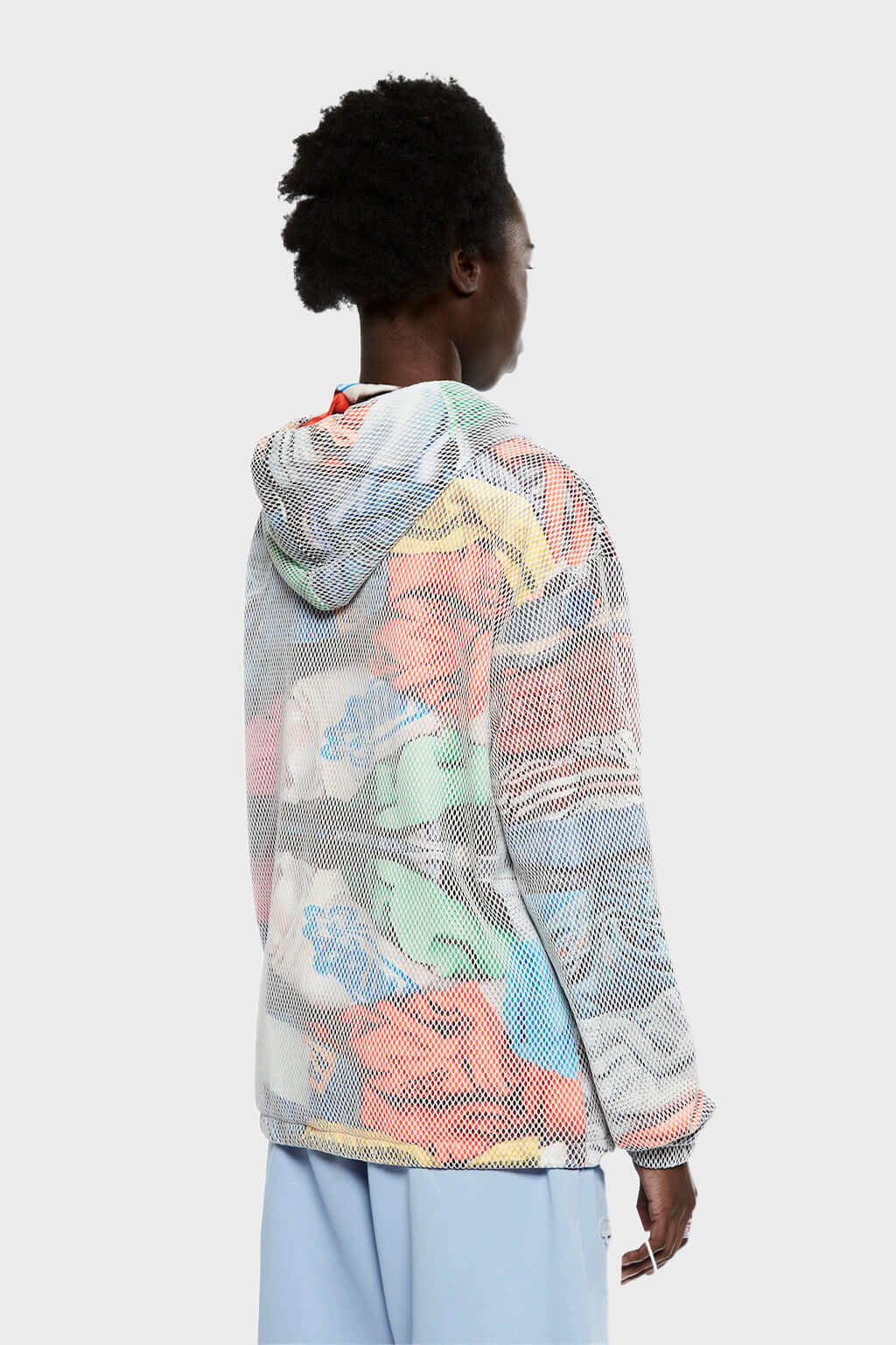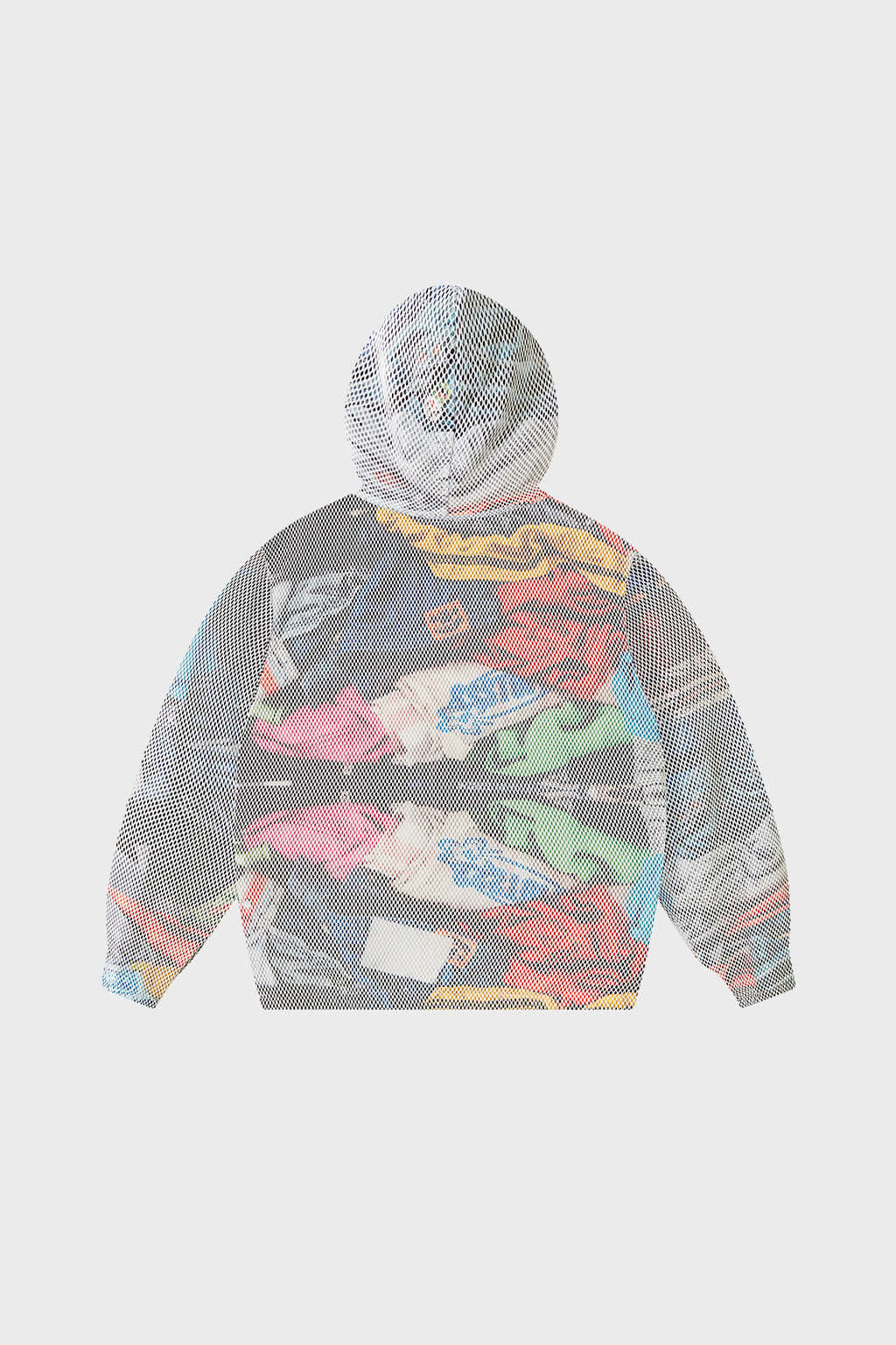 -Zip up hoody with mesh overlay, zip pockets, adjustable elastic at the waist and the option to tear through the mesh to reveal all over graphic.