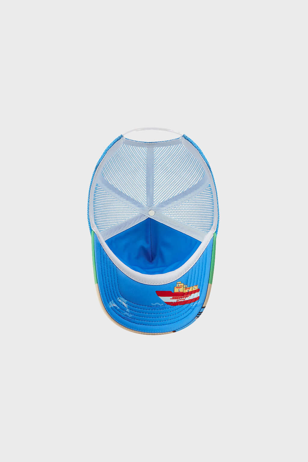 A trucker cap with a city map print featuring various buildings.