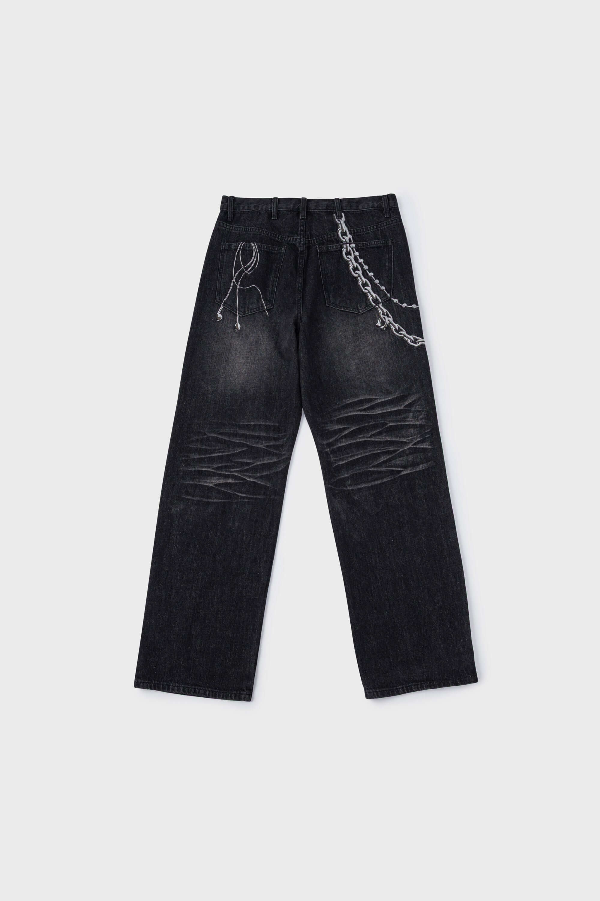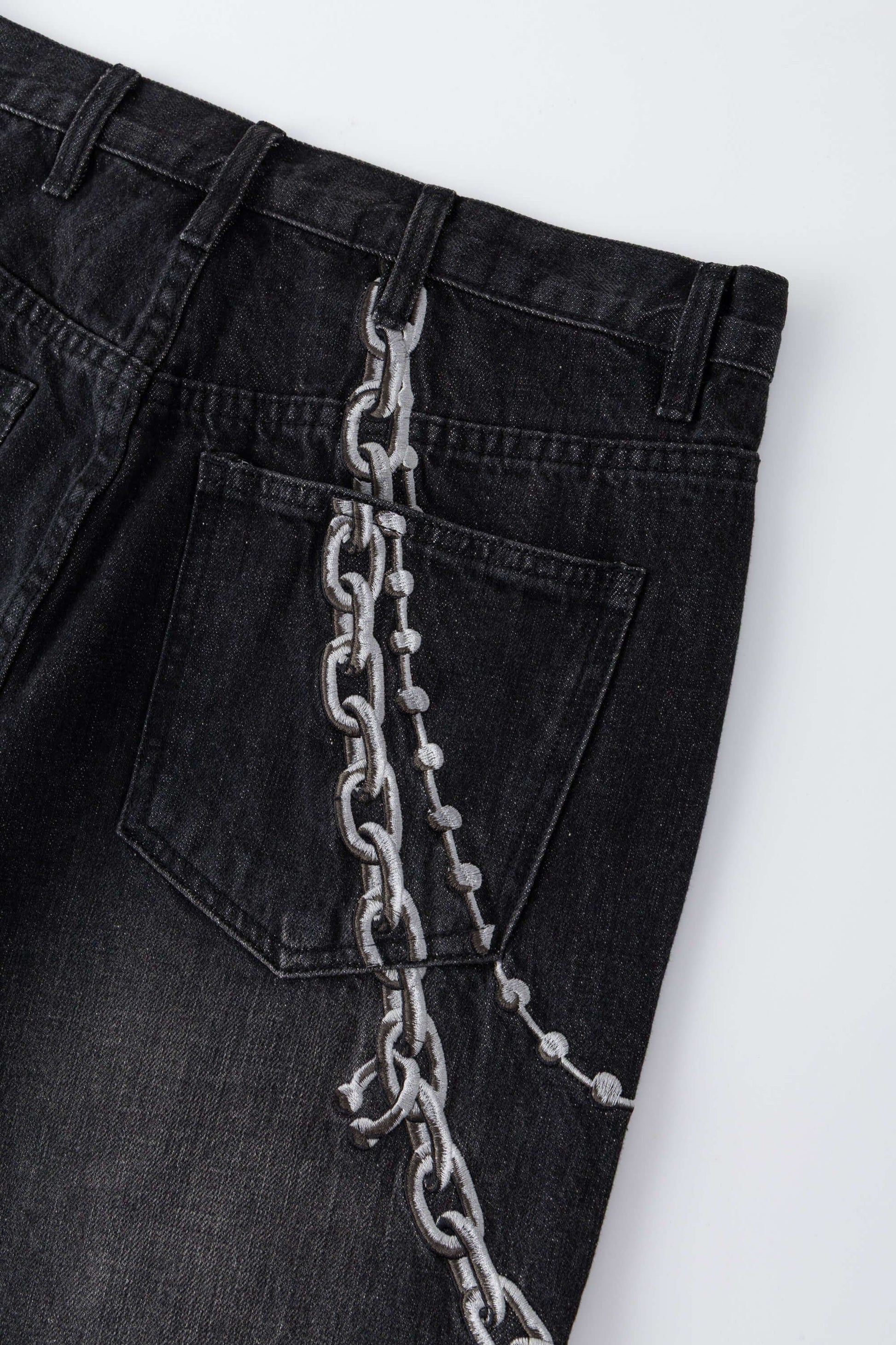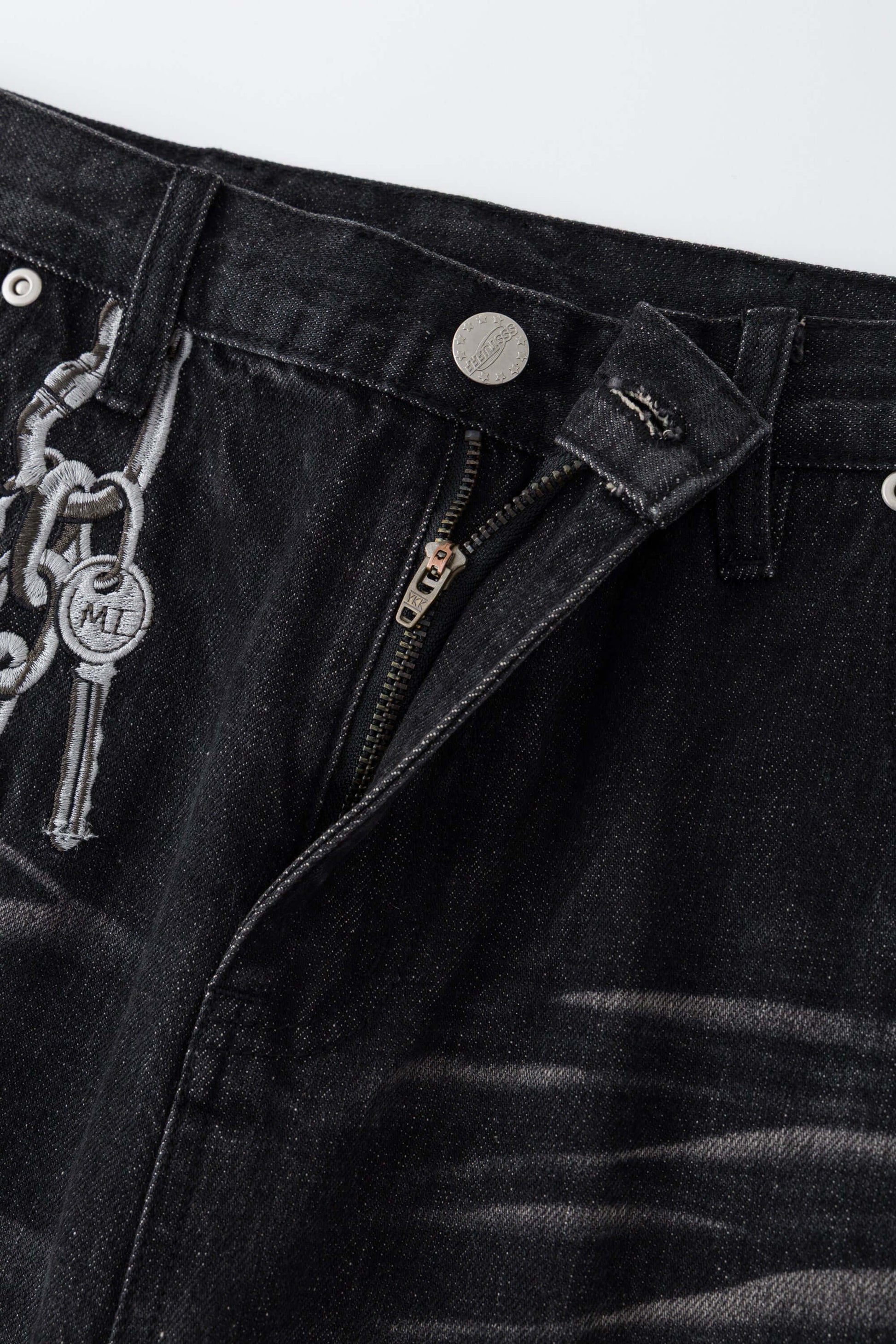 -Keychain embroidery with carabiner and ball chain running across leg (front, back, and pocket)