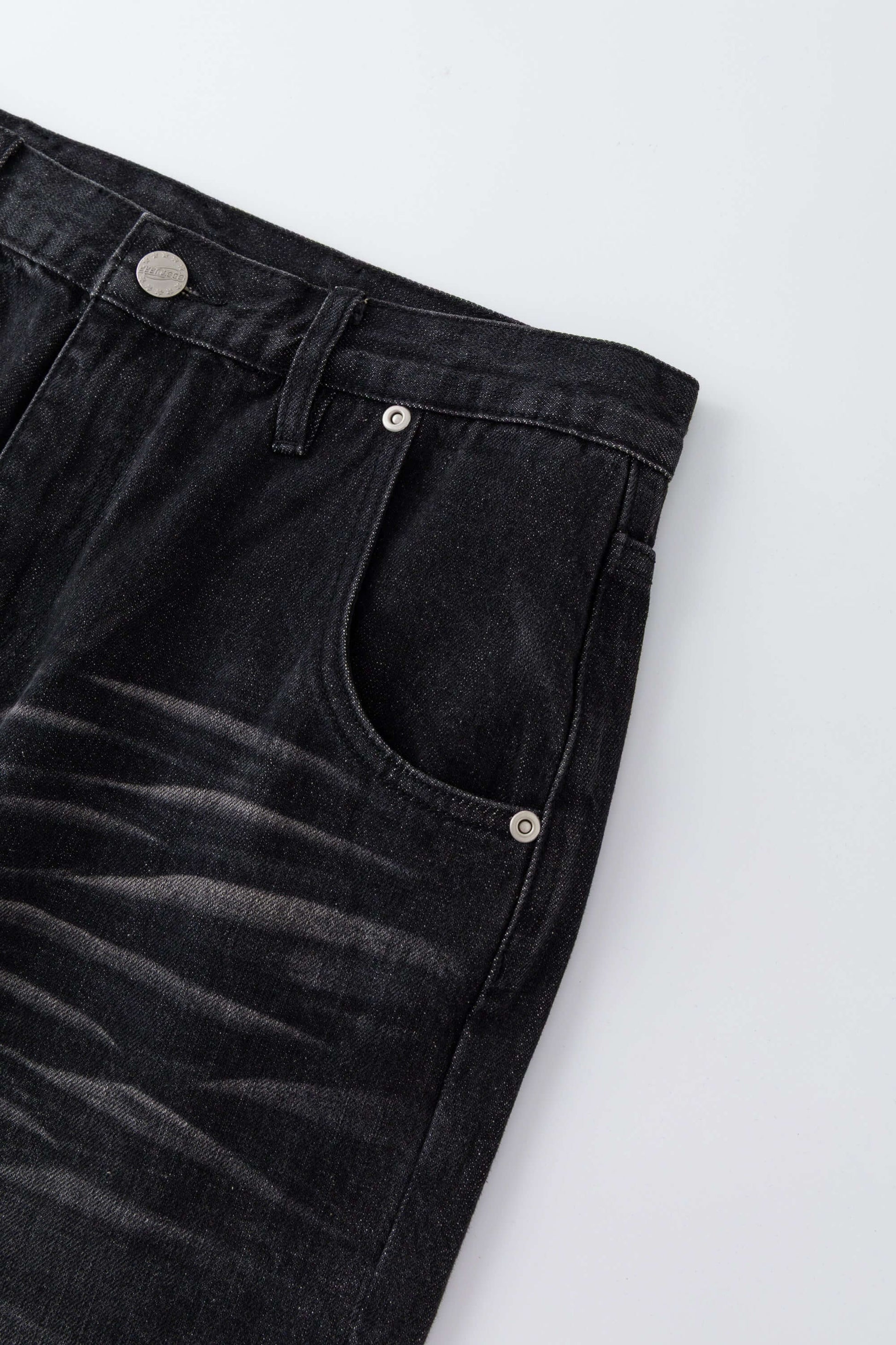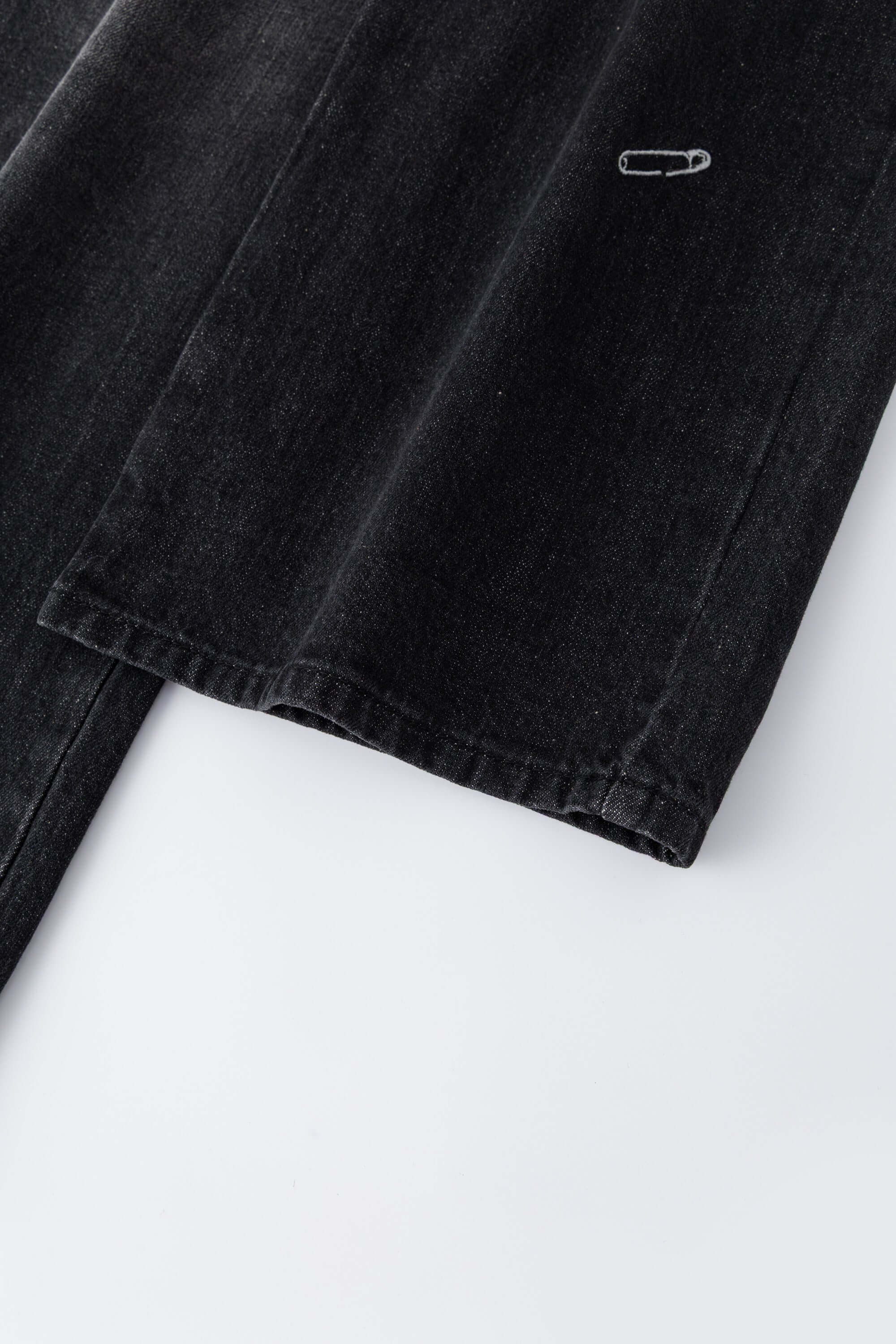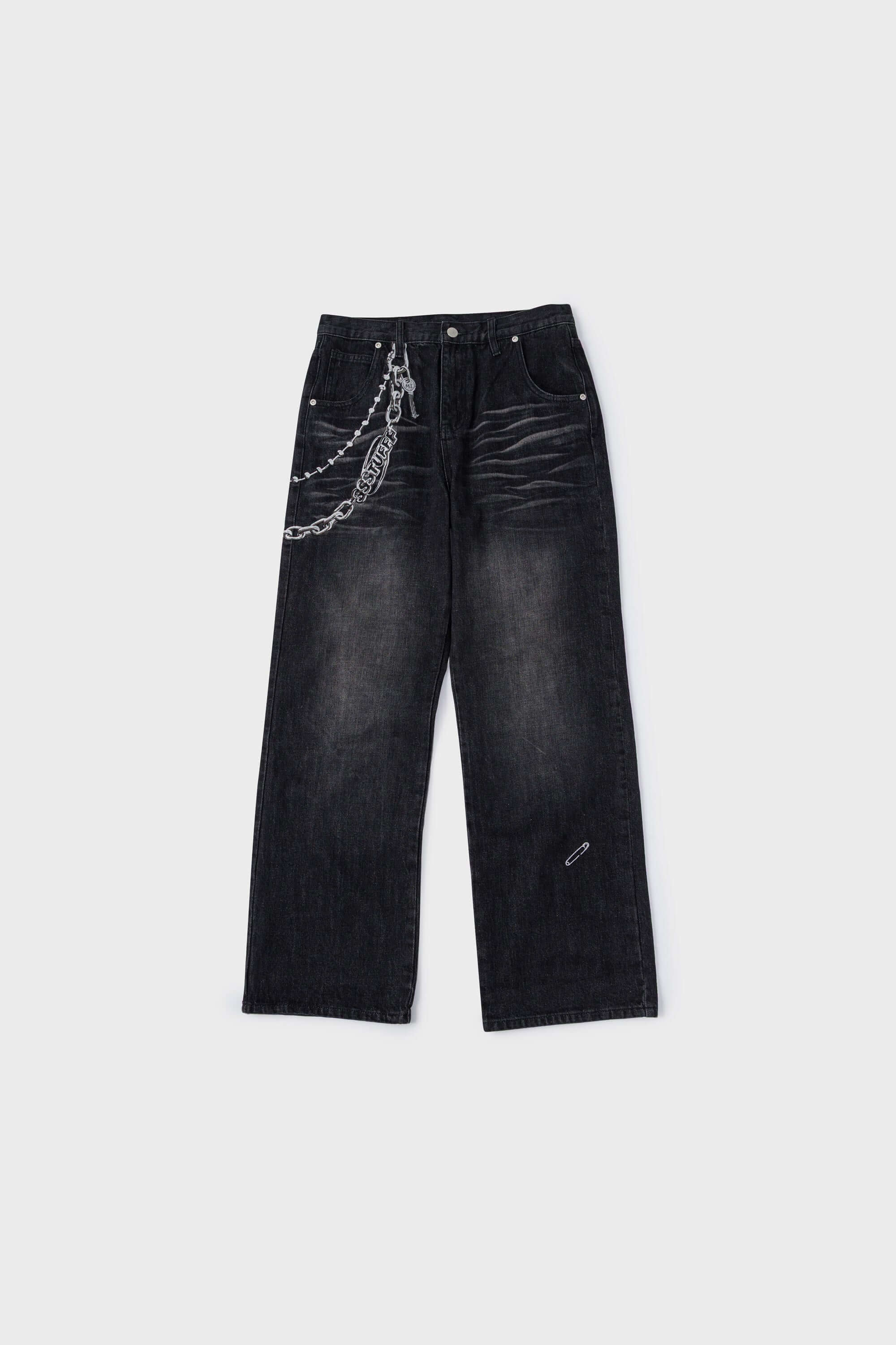 -Keychain embroidery with carabiner and ball chain running across leg (front, back, and pocket)