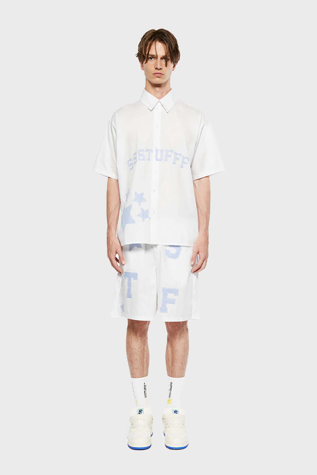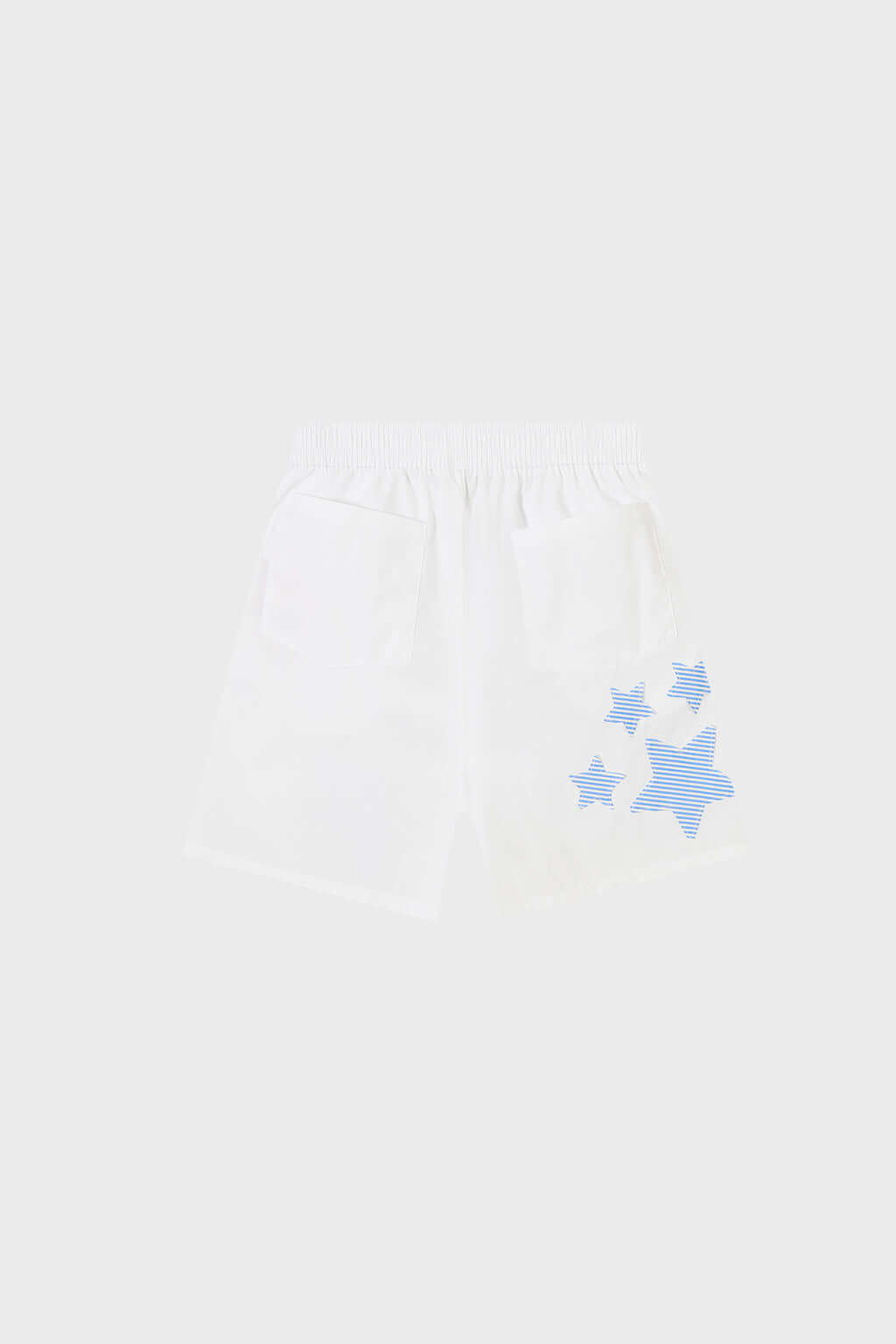 -Classic white shorts featuring stars and STF patchwork on the front and back.