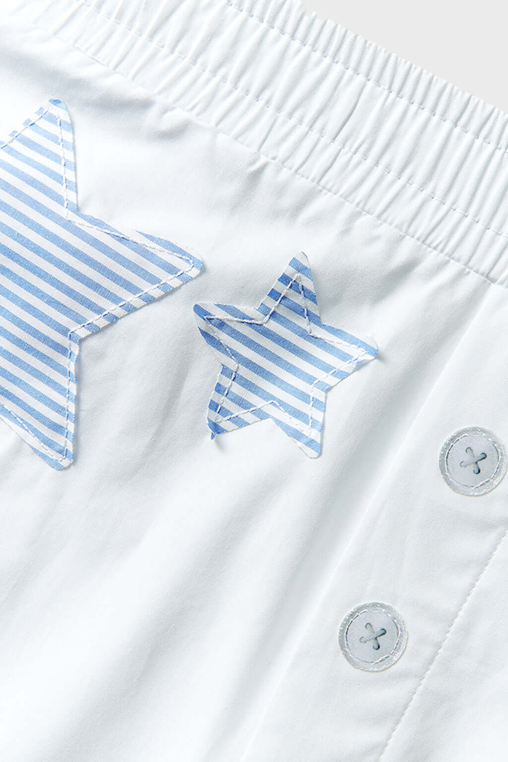 -Fake button patch,white shorts, blue bengal striped accents with oversized fit.