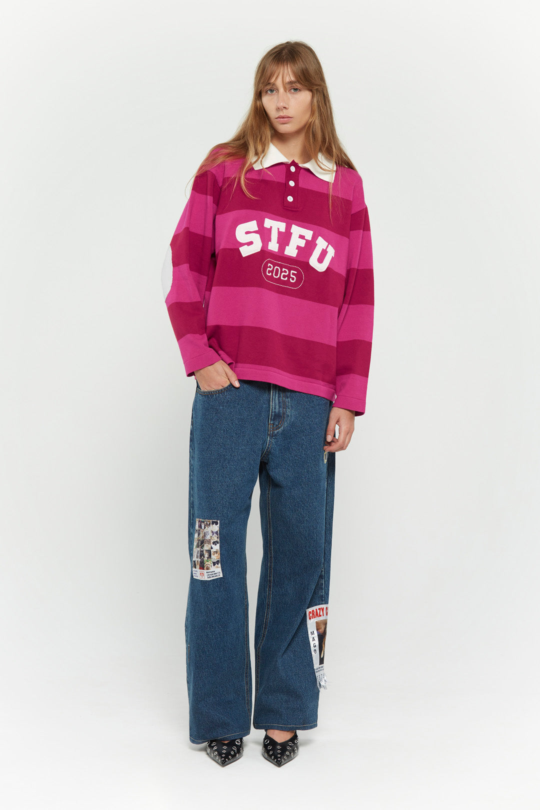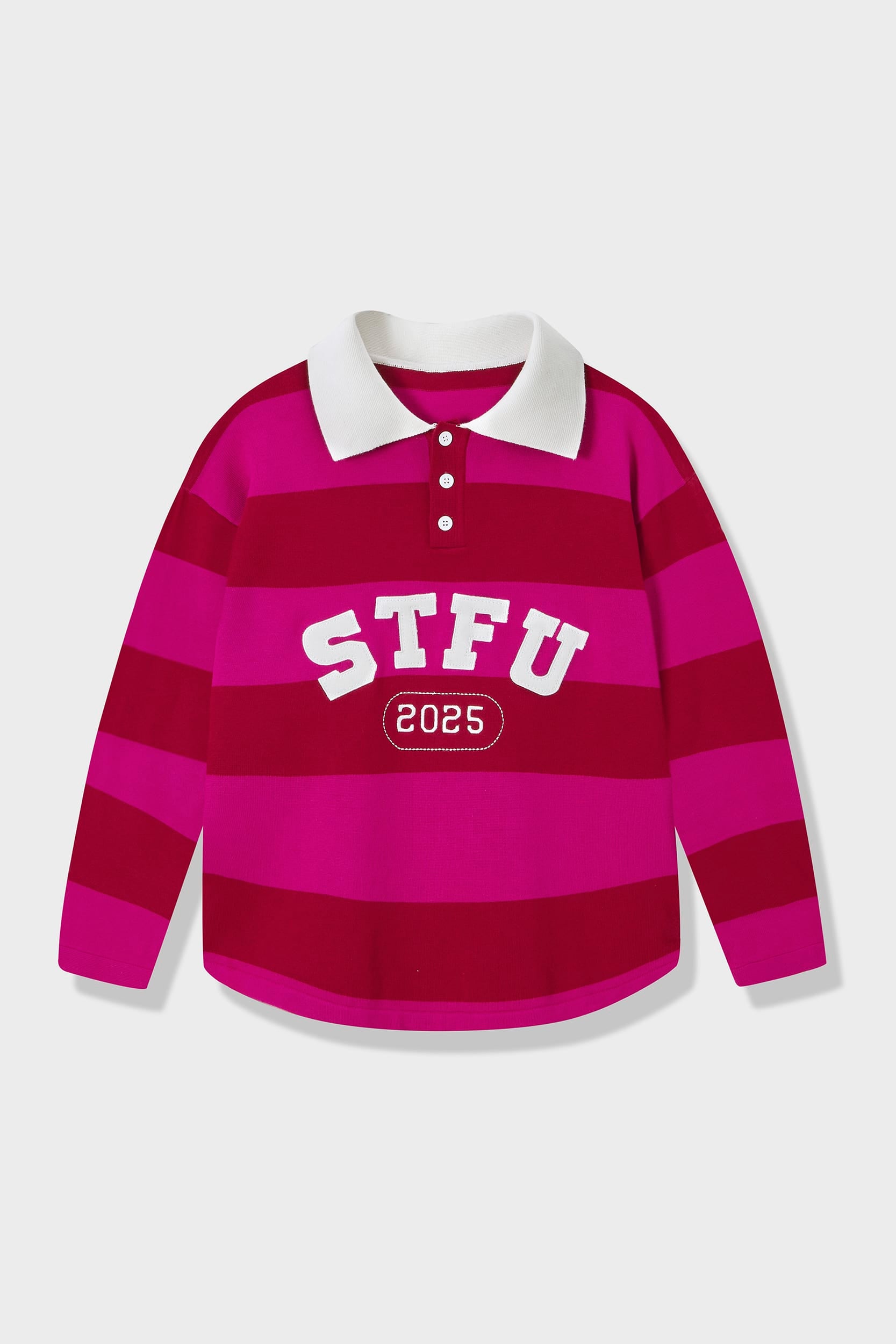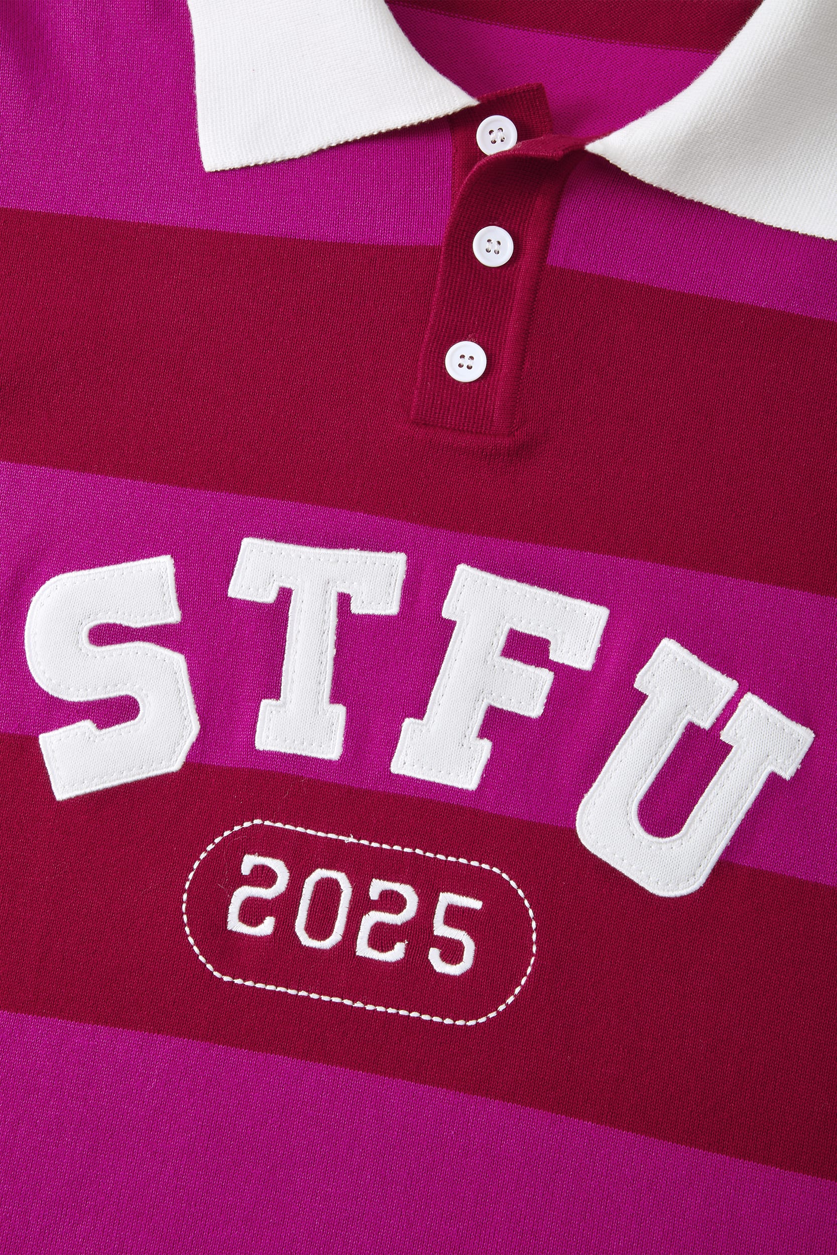 -Striped Rugby polo with contrast collar, patchwork “STFU” 🤐 and embroidered 2025.