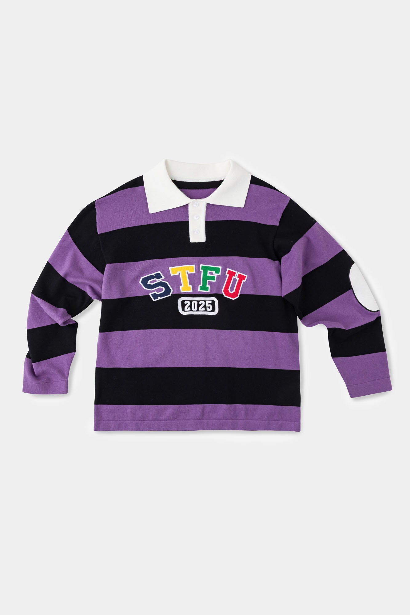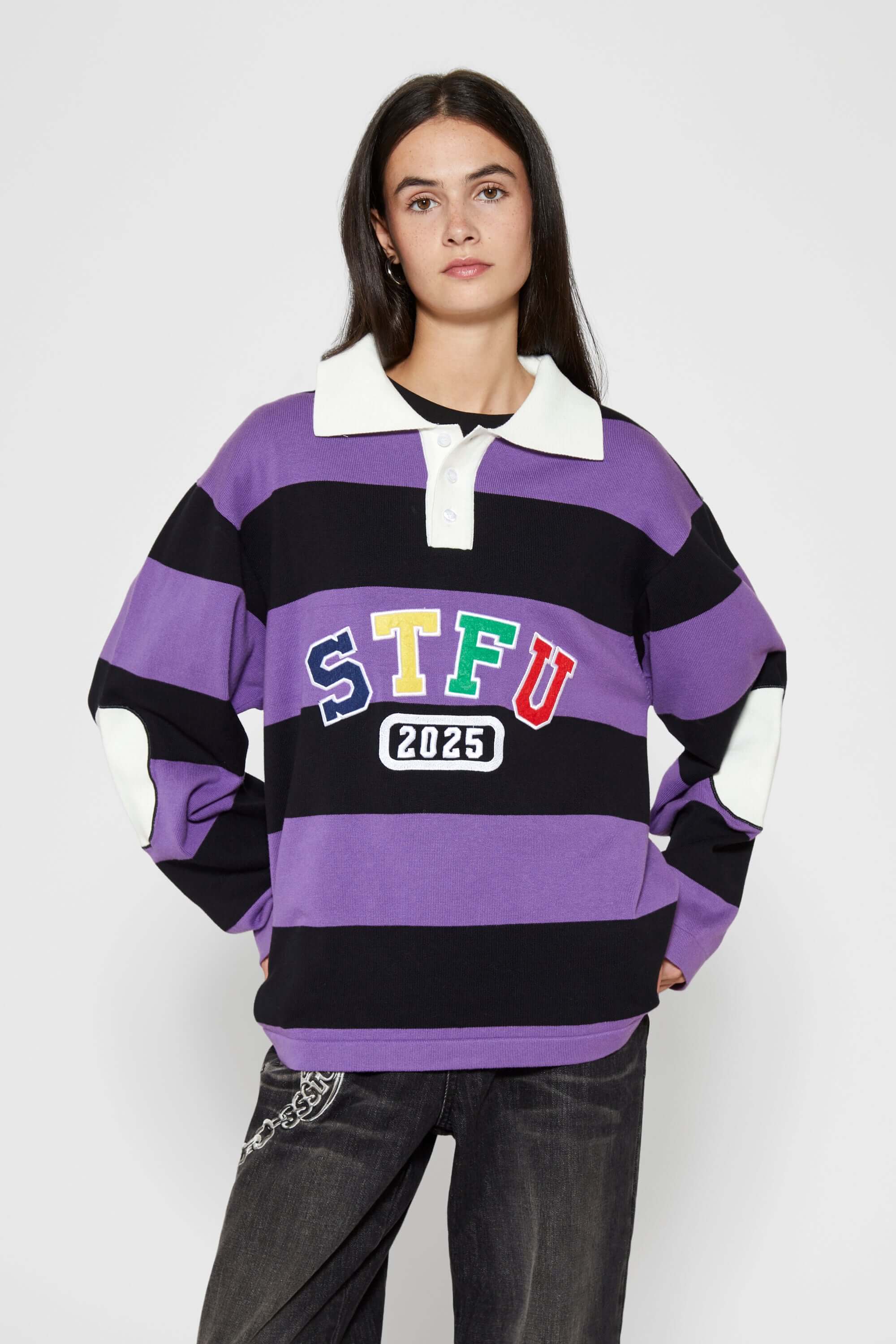 -Patchwork “STFU” lettering and embroidered “2025” detail on the chest