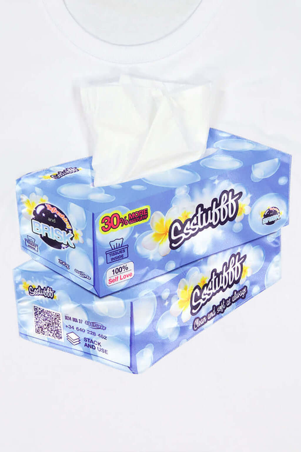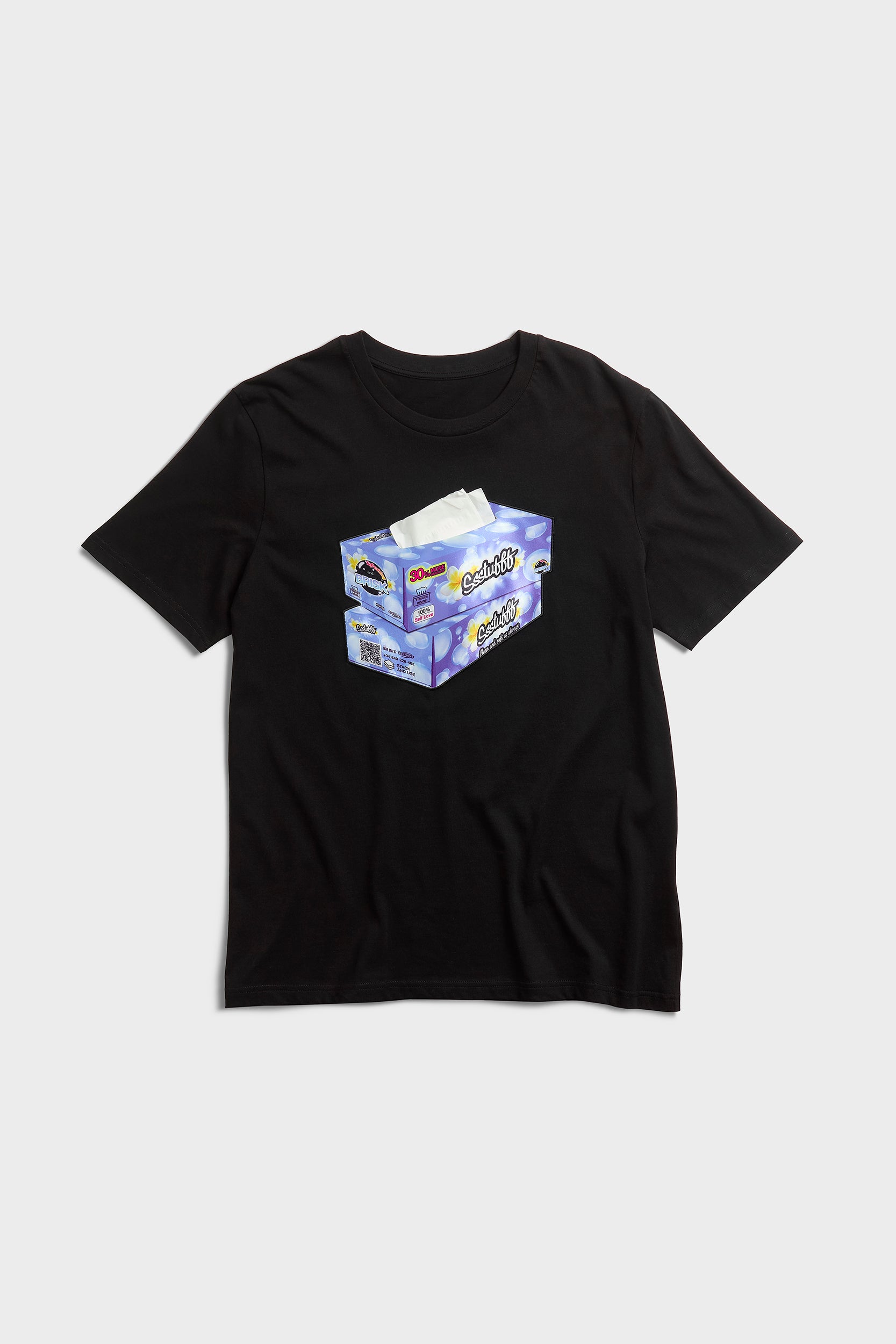 White or black t-shirt with embroidered tissue box patch on chest and functional tissue paper dispenser